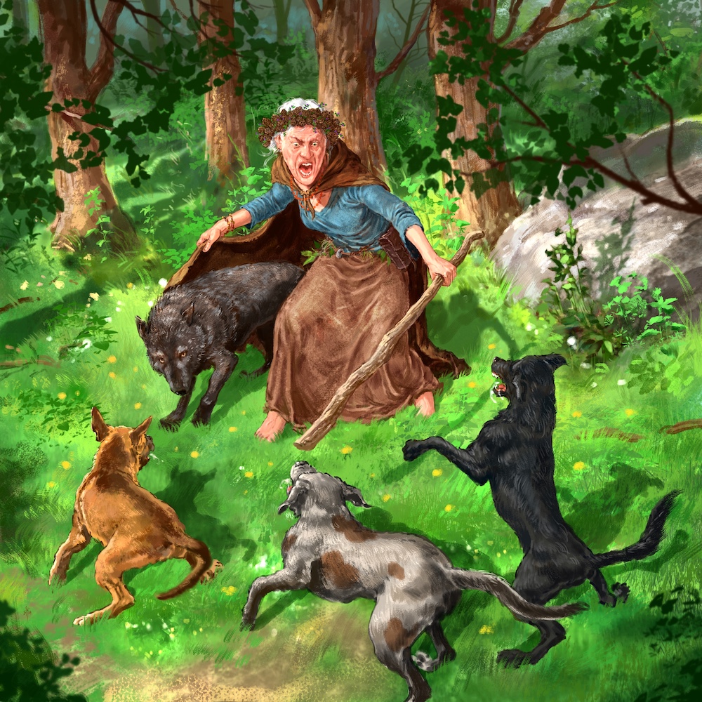 Razu jednego poszczuł na przykład te psy na samotnego wilka, który na skraj lasu koło wsi wyszedł. Chudzina to była, wilk nieduży – byle baran dałby mu radę. A ten psy na niego spuścił. Już miały wilka dopaść, pianę z pysków tocząc, gdy nagle z lasu wyszła dziwna postać. Była to wysoka pani, niemłoda, ale widać, że silna, odziana w rudy płaszcz, koloru sosnowego pnia o zachodzie słońca, przepasana pasem z igliwia, na głowie zaś miała wieniec z szyszek i jagód. Otoczyła wilka płaszczem i odpędziła psy. Gdy podskoczył do niej ten przybysz, strzelbą grożąc, kazała mu we własne złe serce wejrzeć i rzekła: